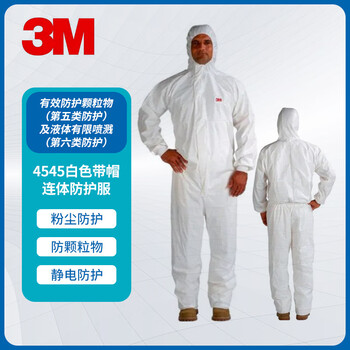 3M 4545 连体带帽防护服 防工业粉尘实验室液体喷涂农药机械维修清洁 可备注尺码M-XXL